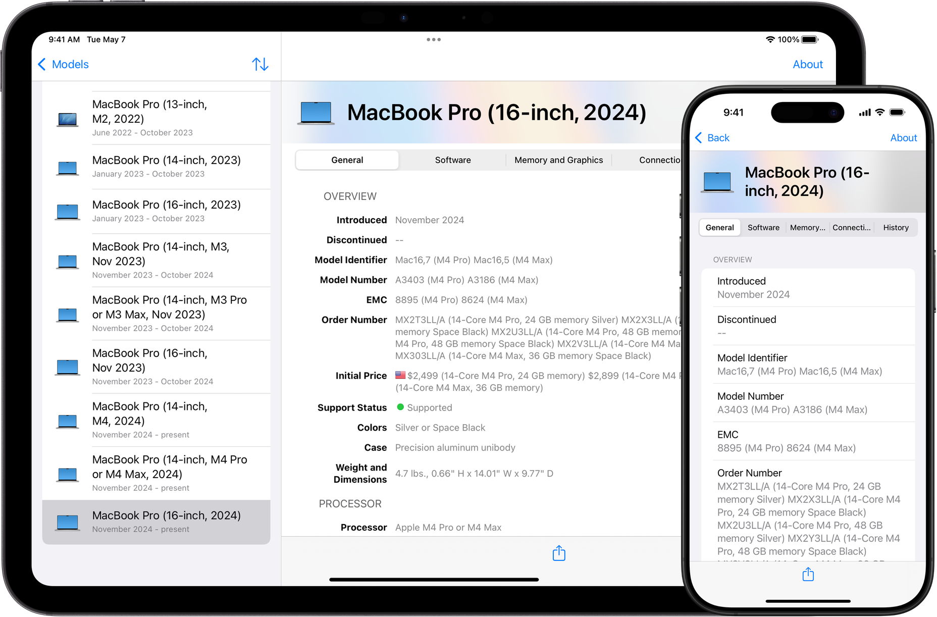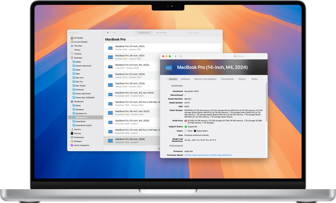 Mactracker provides detailed information on every Apple Macintosh, iPod, iPhone, iPad, Apple Watch, and Apple Vision Pro ever made, including items such as processor speed, memory, graphic cards, supported OS versions, price, storage, and expansion options. Also included is information on early Apple systems, Newton, Apple TV, Apple accessories, audio, displays, modems, printers, scanners, storage, Wi-Fi products, and operating systems.